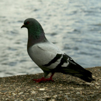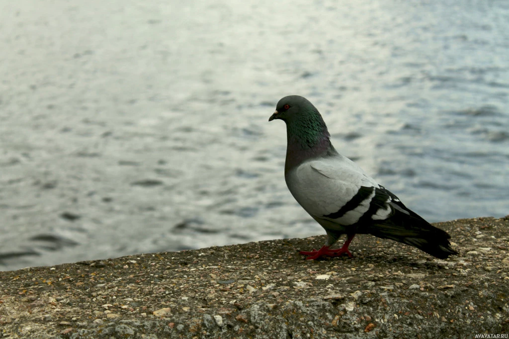 The image shows a bird, specifically a pigeon, standing on the edge of what appears to be