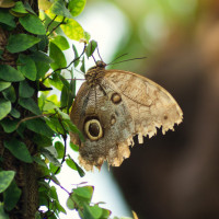 The image shows a butterfly resting on the leaves of a plant. The butterfly appears to be a Lacewing, which is known for its intricate patterns on the wings. It's sitting on what looks like Ivy or a similar type of foliage, and the background suggests a lush green environment, possibly a jungle or rainforest setting.