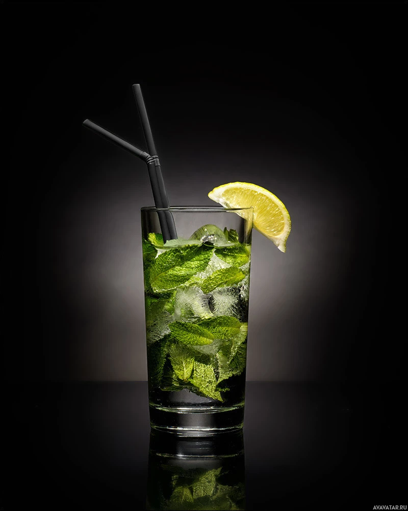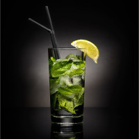 mint leaves, indicating that this may be a type of mojito or another cocktail involving mint. The background is dark, which contrasts with