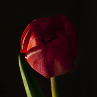 The image shows a single red tulip in close-up, with its petals slightly open and the stem visible. There is a dark background which contrasts with the bright color of the flower.