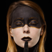 body art or performance makeup. Her finger is placed near her mouth in
