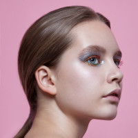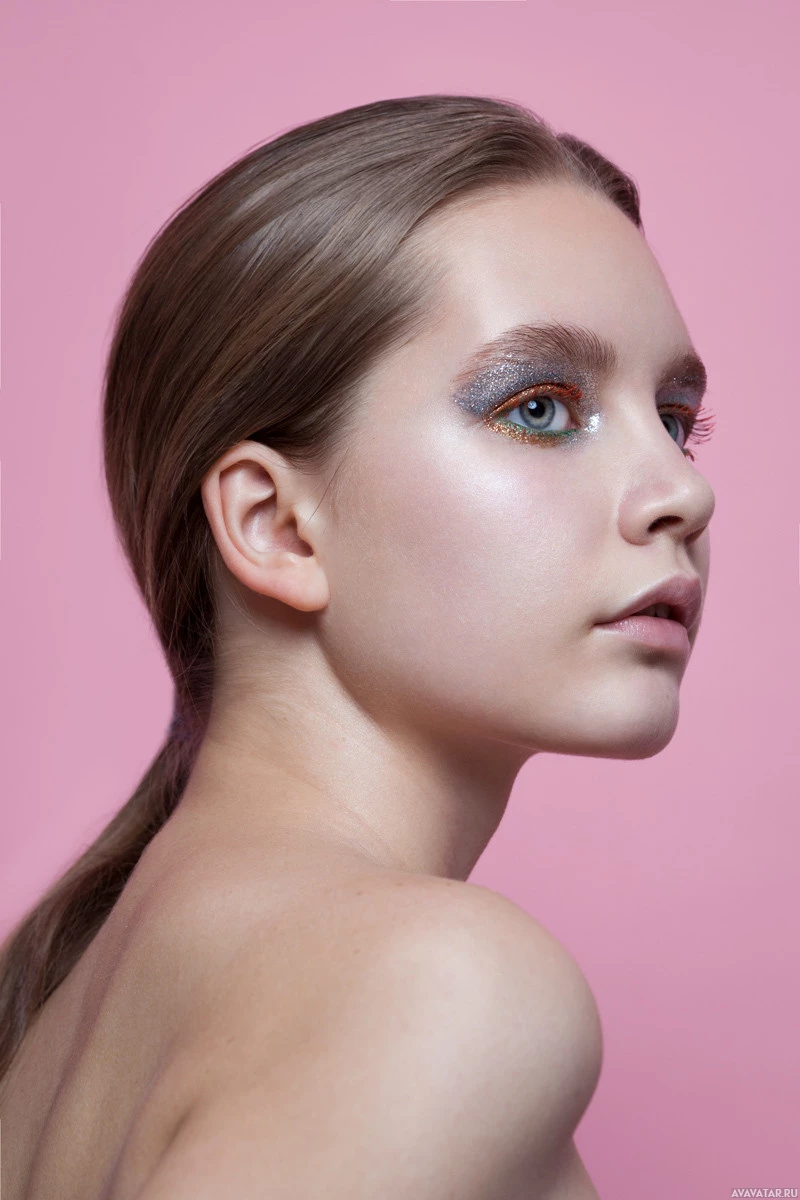 a young woman with her back to the camera, looking over her shoulder. She has light-colored hair and is wearing makeup that includes glittery eyeshadow in different