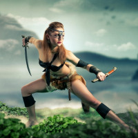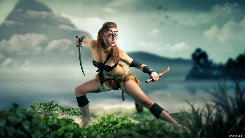a female figure dressed in what appears to be ancient or tribal clothing, suggesting a character from a historical or fantasy setting. She is holding what looks like a bow and arrow, posed as if ready for action. Her attire includes elements such as feathers or headdresses that are reminiscent of pre-historic or indigenous costumes. The background depicts