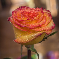 На картине изображен крупный план одной розы с лепестками, которые кажутся слегка влажными, возможно, от дождя или росы. Роза находится в фокусе, а фон размыт, что привлекает внимание к цветку.