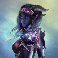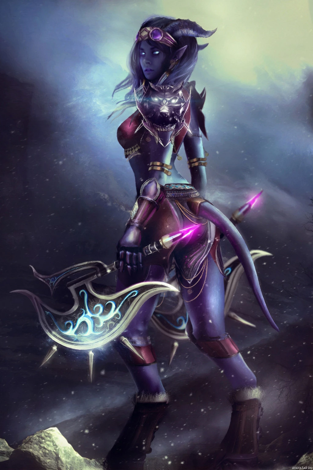 blue skin and horns, and is equipped with armor that has a distinctive look, featuring a combination of purple and blue elements. The character also carries a weapon, adding to the fantasy theme.