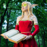 pointed ears, which is characteristic of elves in many fantasy settings. In their hands, they hold a large open book, suggesting that they may be a character like a bard, wizard, or scholar within the context of