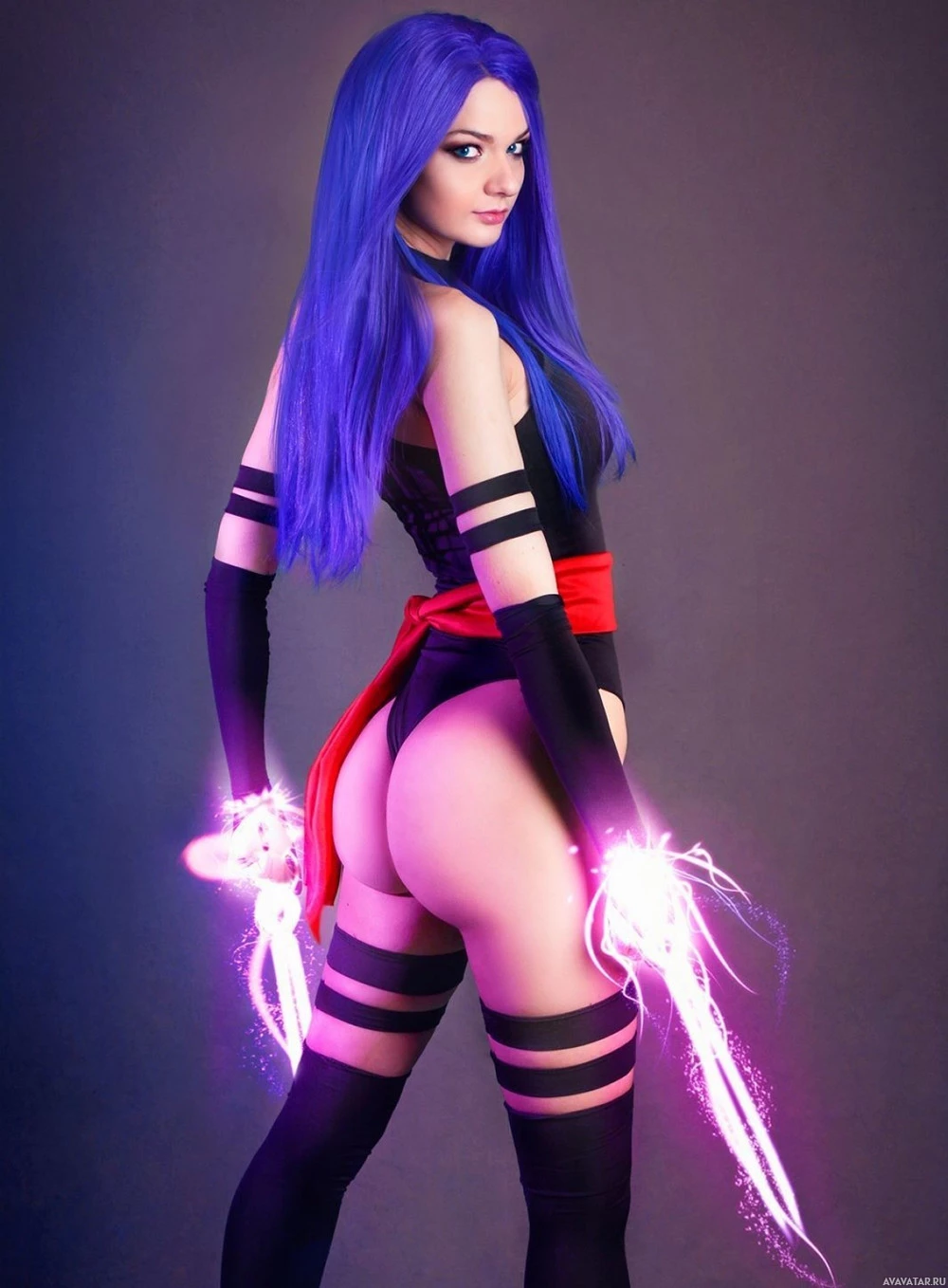 blue hair, wearing a black and red costume that seems to be inspired by a character from pop culture. They are holding what appear to be energy blades or swords emitting sparks of electricity, suggesting they may have