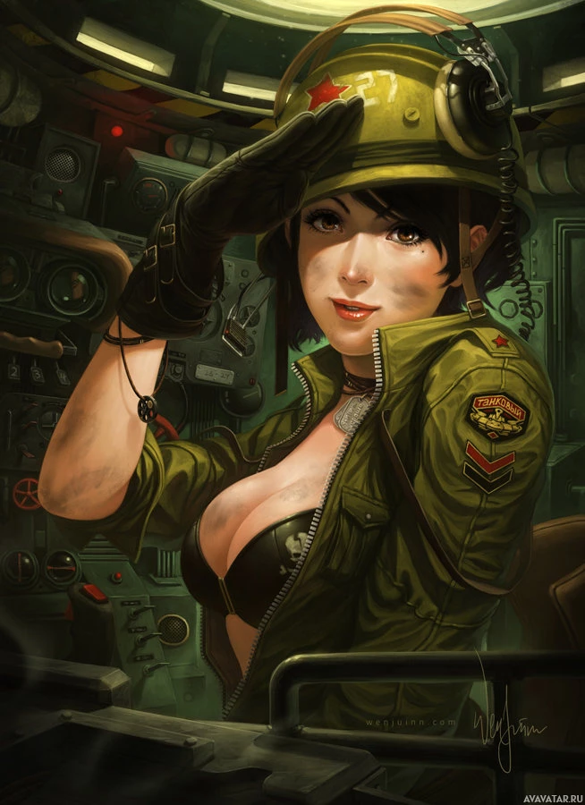 an illustrated character that appears to be a female soldier from the Russian army. She has short