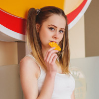 a young woman sitting on what appears to be an orange bar stool. She is wearing