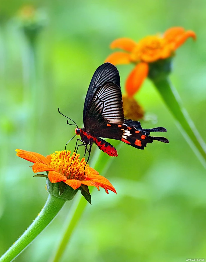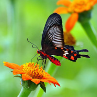 vibrant colors and detailed wing patterns. The background is blurred and green, suggesting that this scene is taking place in an outdoor setting, possibly in a garden or