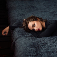 a soft texture, which could be a rug or carpet, in shades of blue that match her outfit.
