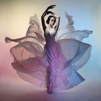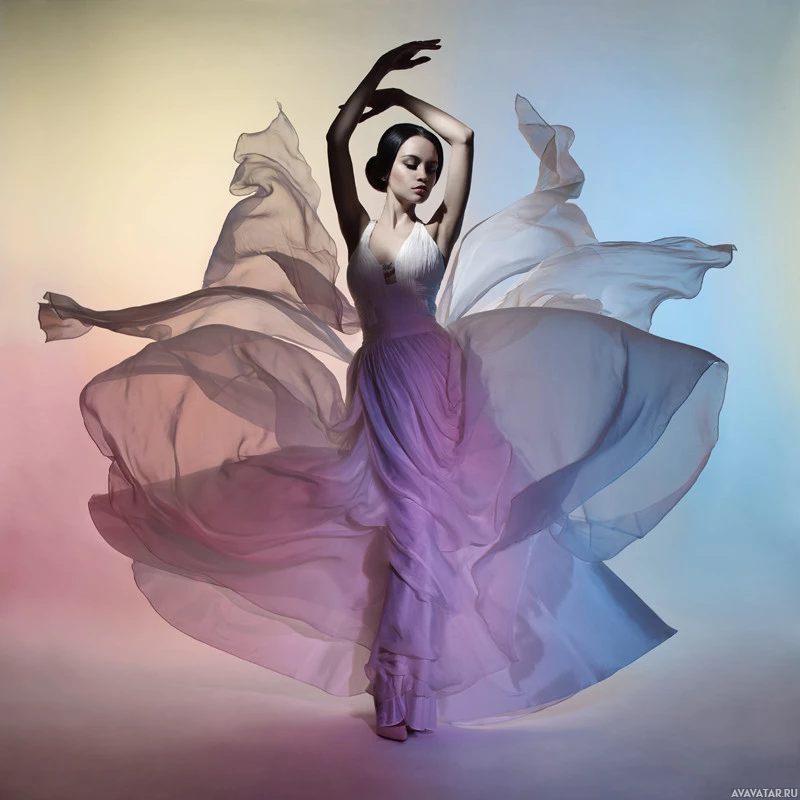 ethereal dress that appears to be made of fabric or chiffon with pastel hues. She is dancing, gracefully lifting one leg and holding her arms out to the sides, giving