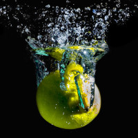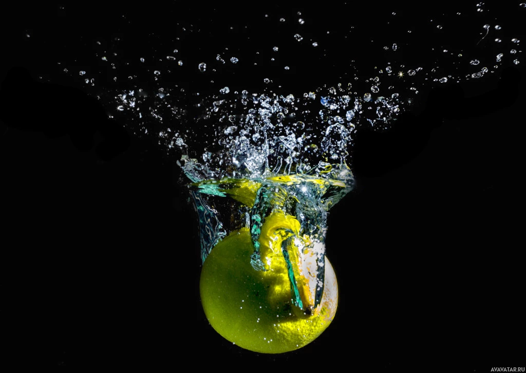 yellow apple being held underwater. Water is splashing around the apple, and there are ice cubes present as well, indicating that the photo was taken in