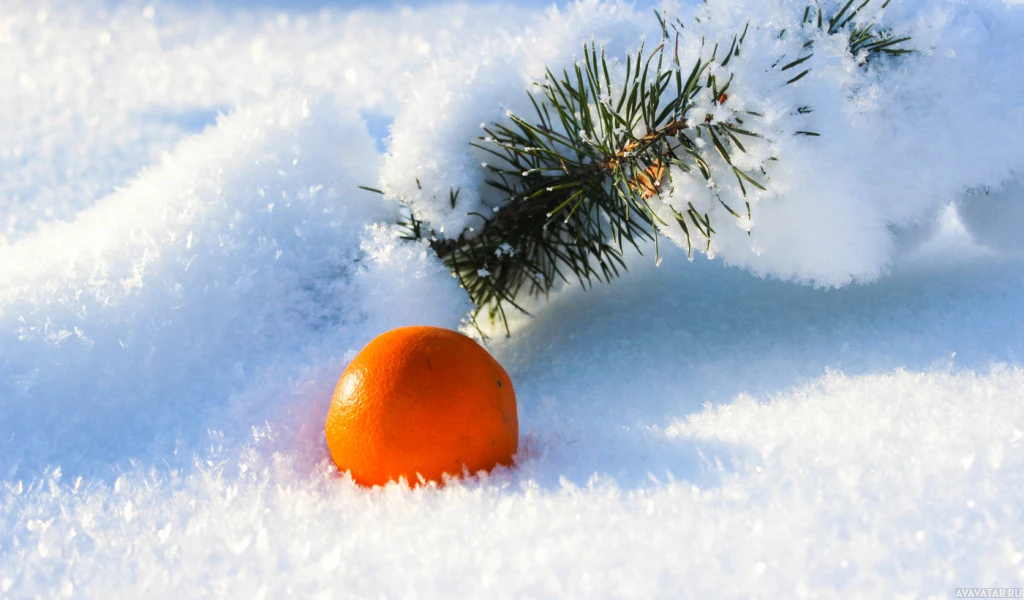 Изображение имеет снежный пейзаж. На переднем плане есть апельсин, который был частично похоронен в снегу. Над апельсином есть покрытые снегом сосновые иглы, которые напоминают рождественскую елку. Контраст между ярким оранжевым и белым снегом создает поразительный визуальный эффект.