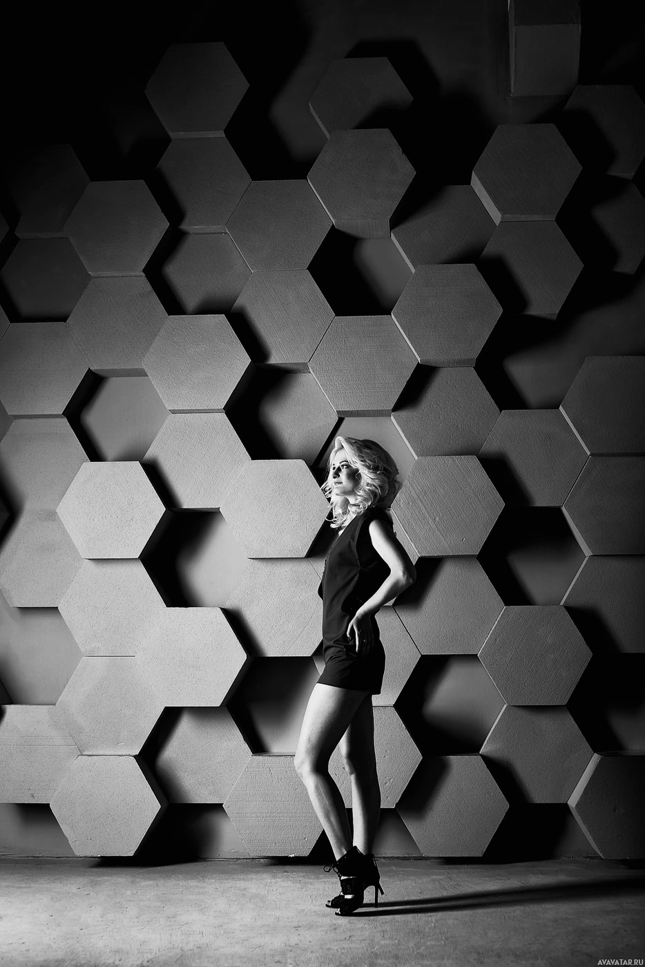 honeycomb pattern. She appears to be wearing short sleeved attire and high-