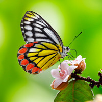 The image shows a butterfly with colorful wings perched on a pink flower. It appears to be feeding or resting on the flowers, which suggests it may be attracted to their nectar for nourishment. This is an example of the beautiful interaction between insects and flora in nature.