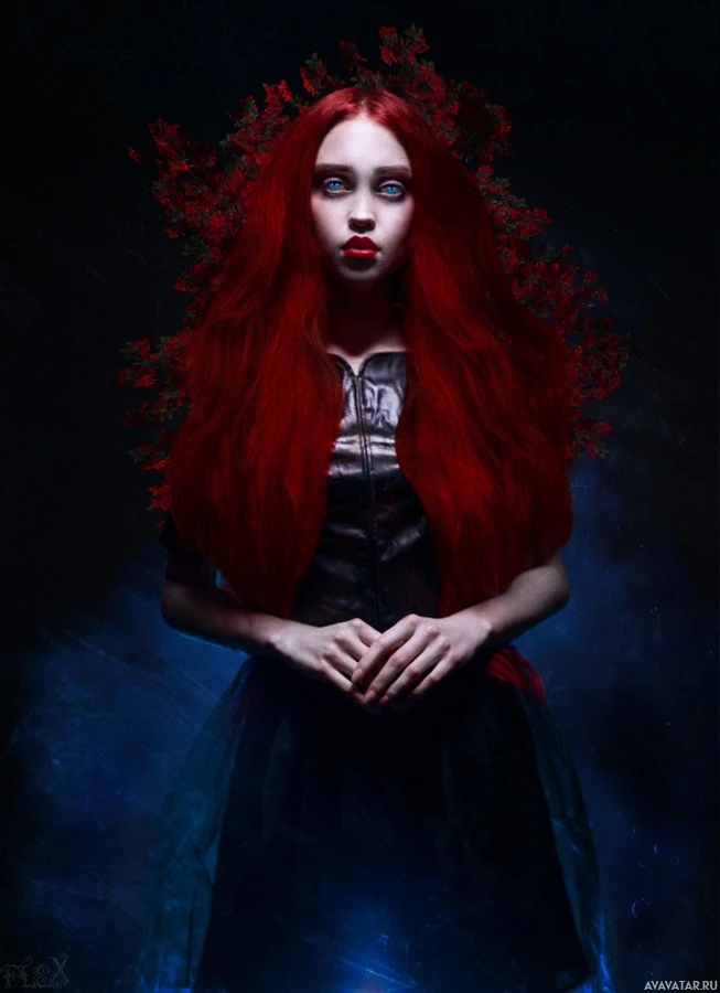 red hair, which is the most prominent feature. This individual appears to have an ethereal or otherworldly look, possibly inspired by fantasy or horror themes. The color palette of the image is quite dark, with a focus on