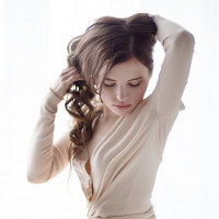 closed eyes, perhaps in a state of relaxation or daydreaming. Her hands are gently resting behind her head as she seems to be enjoying