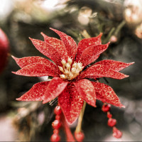 The image shows a Christmas tree decorated with various ornaments. One of the prominent ornaments is a red poinsettia flower, which is traditionally associated with the festive season. There are also other traditional holiday decorations such as shiny golden baubles and what appears to be small candy canes hanging among the branches. The overall scene conveys a sense of celebration and warmth typically associated with Christmas festivities.