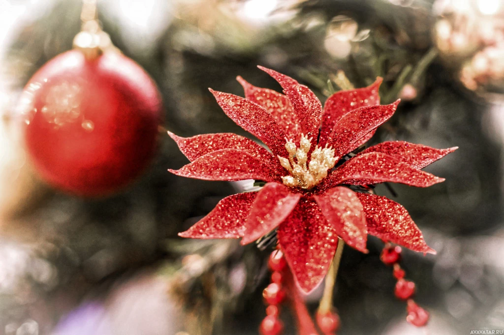 На картинке изображена рождественская елка, украшенная различными украшениями. Одним из ярких украшений является красный цветок пуансеттии, который традиционно ассоциируется с праздничным сезоном. Есть также другие традиционные праздничные украшения, такие как блестящие золотые пузыри и то, что кажется маленькими конфетными тростями, висящими среди ветвей. Общая сцена передает чувство праздника и тепла, обычно связанного с рождественскими праздниками.
