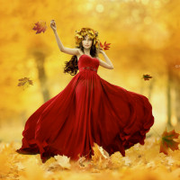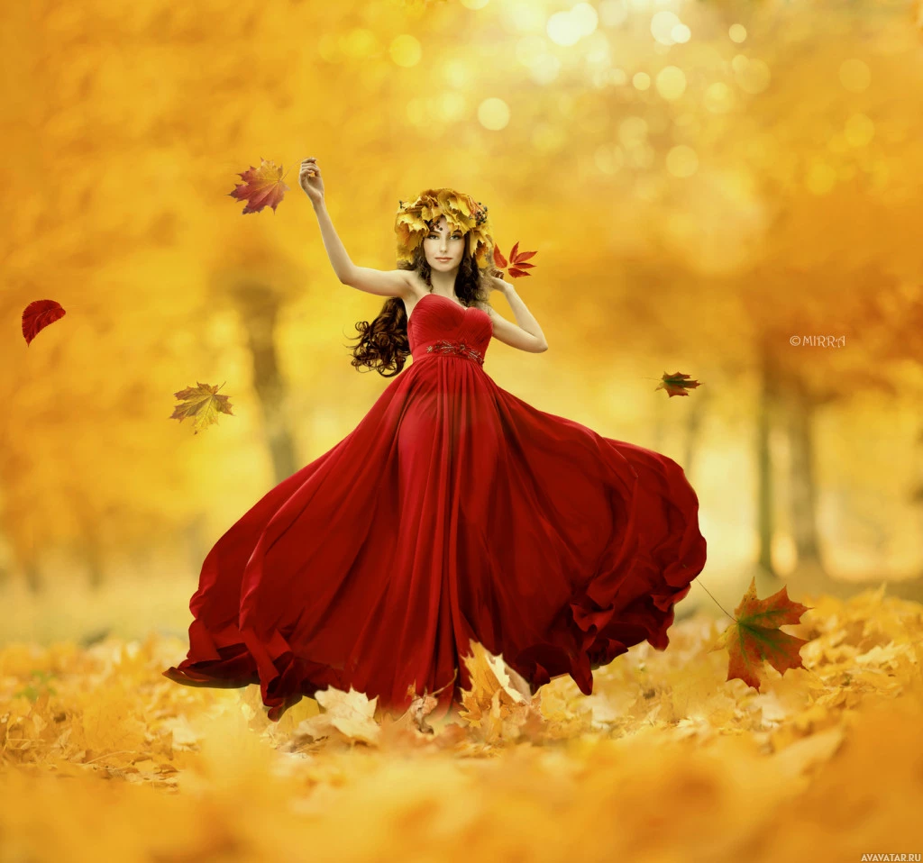 fallen leaves, likely maple leaves, which are associated with the fall season. The woman appears to be dancing or gracefully posing with her arms raised above her head, creating