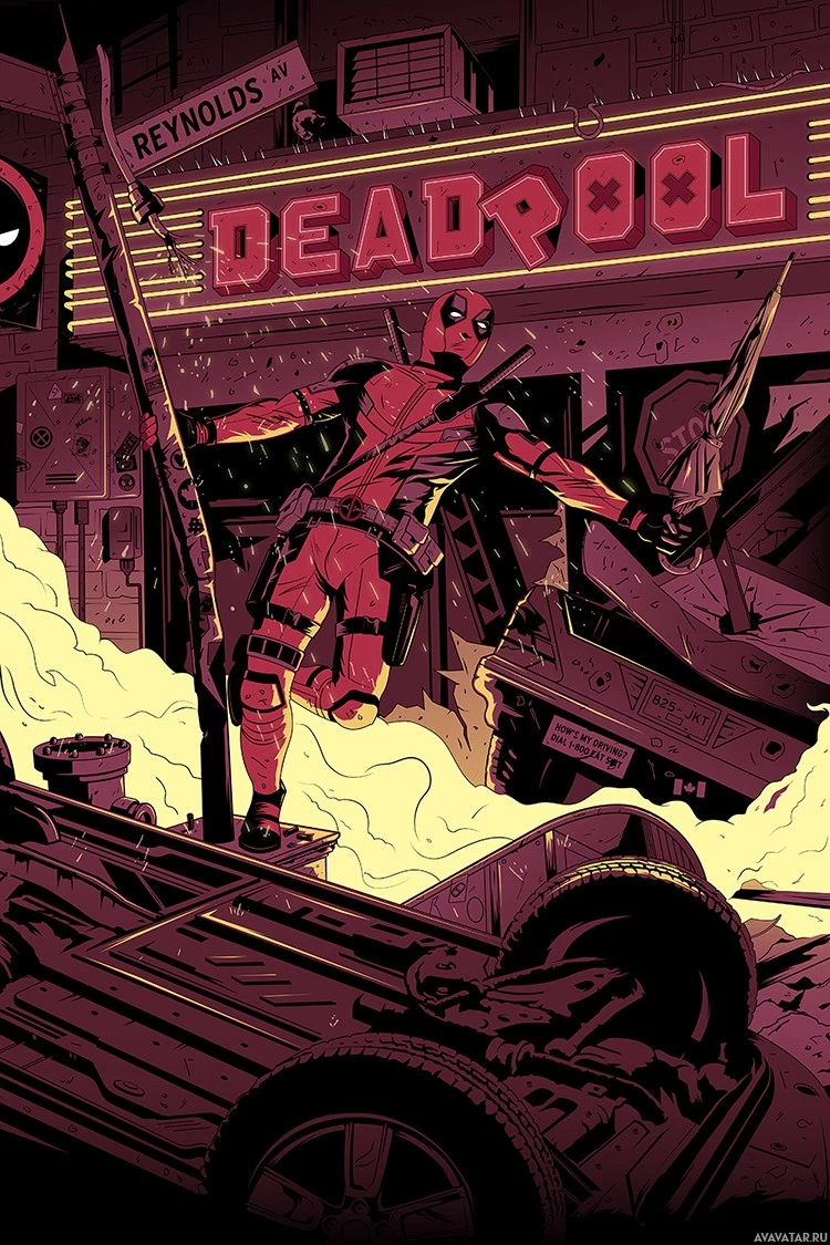 a neon sign that reads "Deadpool," reinforcing the identity of the character. There's