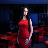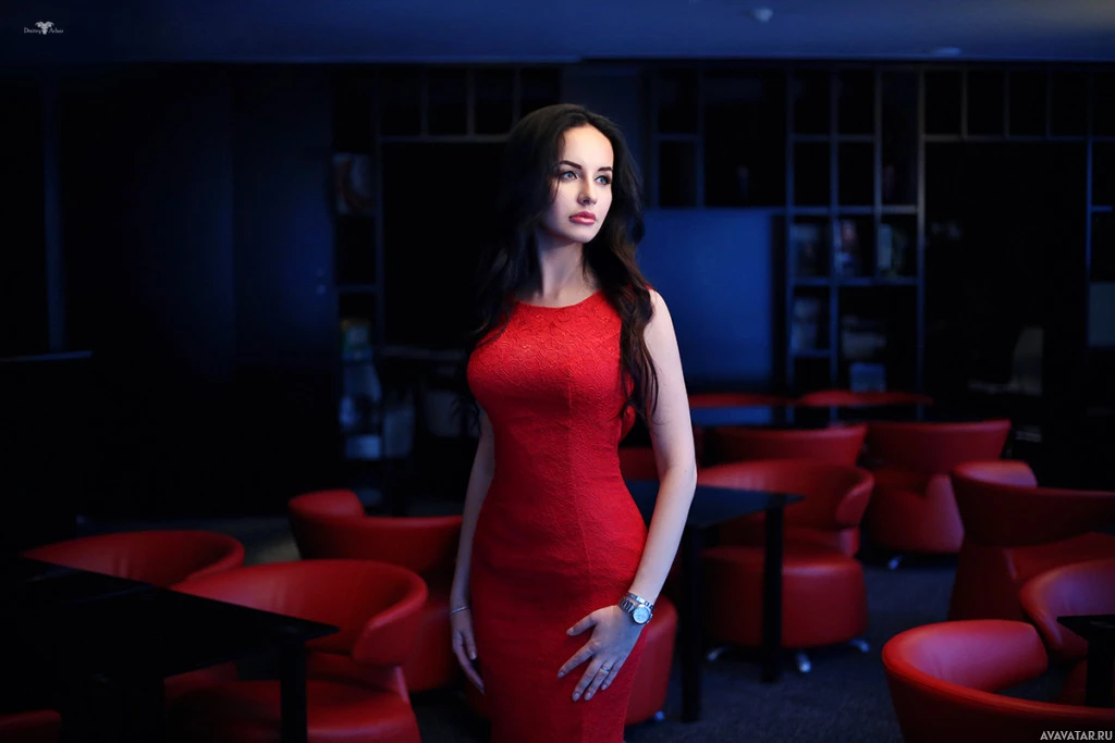 dark hair, and she is wearing a red dress with short sleeves and a high slit on the side, showcasing her legs. Her pose is confident, with one hand on her hip and the other resting on a table or surface nearby. The room around her is dimly lit, creating