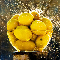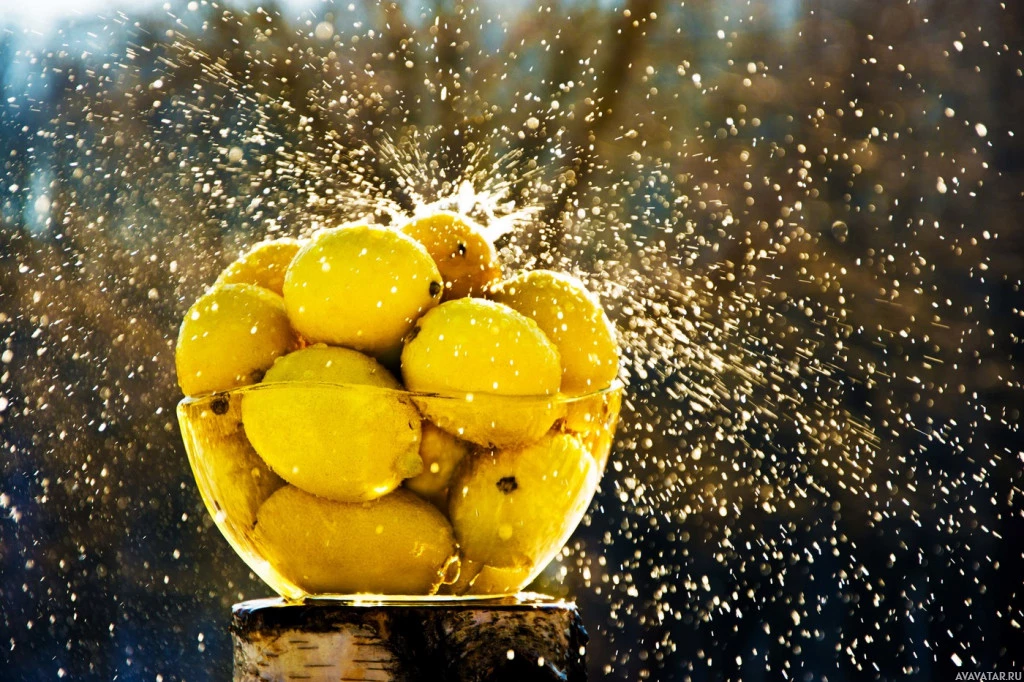 The image features a bunch of lemons that appear to be squeezed or cut open, causing juice to squirt out and create a spray-like effect. The background is blurred, emphasizing the motion and intensity of the splattering