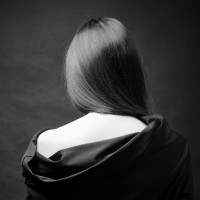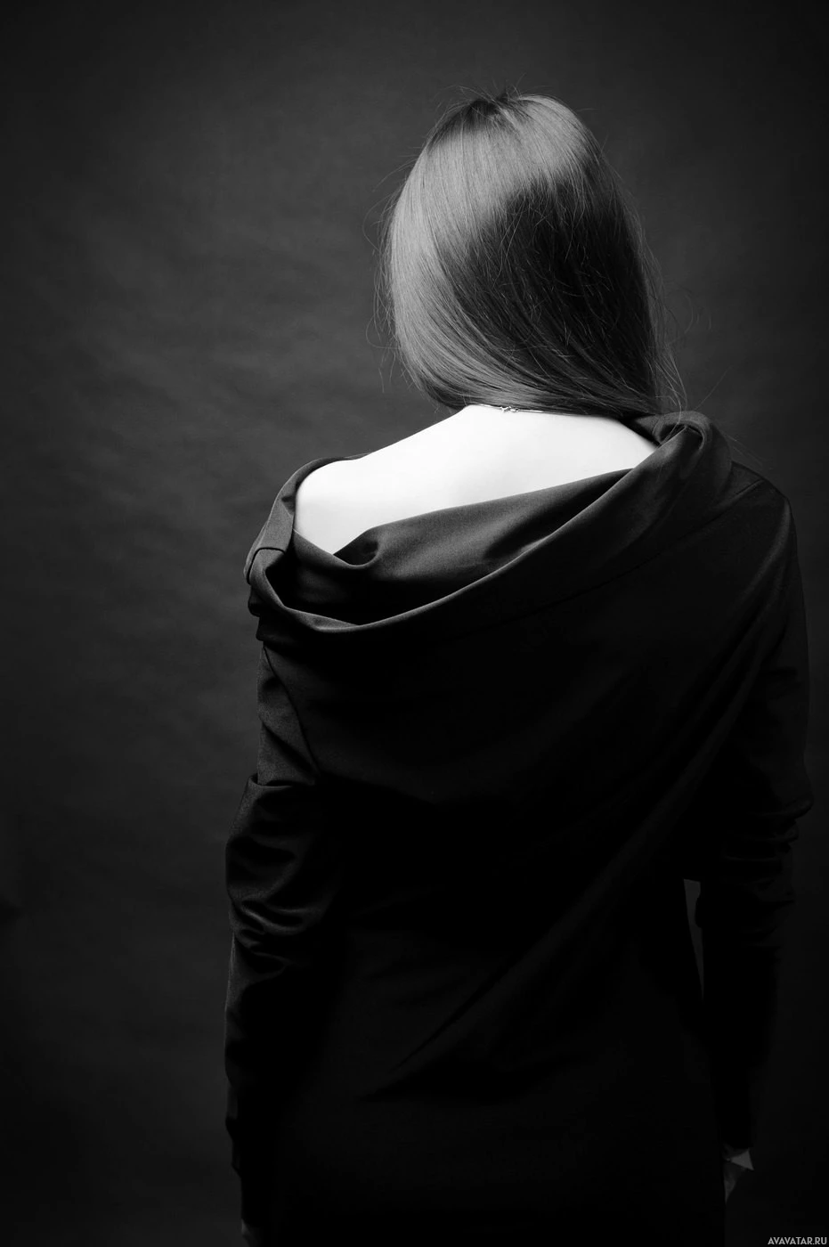 The image shows the back of a person, presumably a woman, wearing a dark-colored top or dress with
