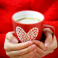 The picture shows a person's hands holding a red mug. It appears that the individual is enjoying a warm beverage, possibly coffee or tea, as suggested by the context provided. The mug has a floral design on its side.
