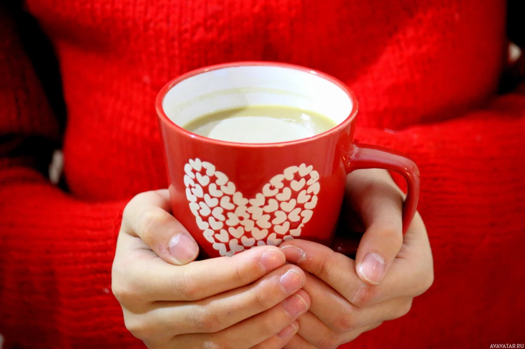На снимке изображены руки человека, держащего красную кружку. Похоже, что человек наслаждается теплым напитком, возможно, кофе или чаем. Кружка имеет цветочный дизайн на своей стороне.