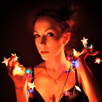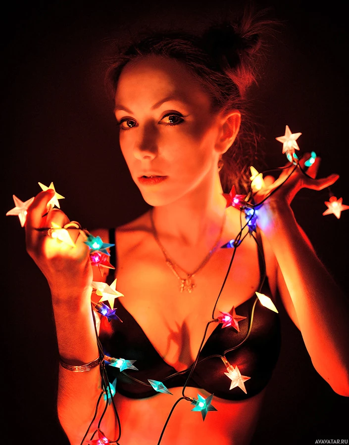 a dark background, and there is a focused light on her face which creates a dramatic effect. The lights she holds are illuminated with yellow and blue bulbs that give the appearance of starlight. The woman seems to be dressed in lingerie or a similar type of underwear, adding a provocative element to the image.