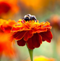 a single bee, perched on top of the flowers. The bee is likely a bumblebee, characterized by its