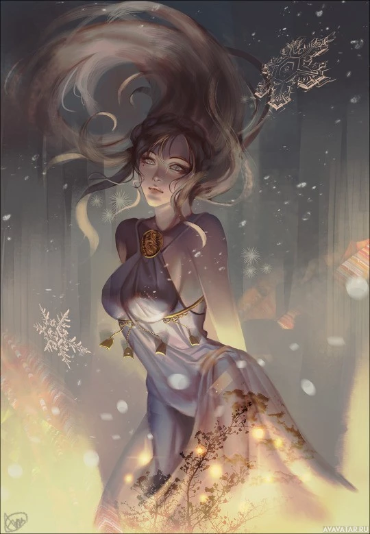 mythological fashion, possibly hinting at a fantasy or historical theme within the context of this illustration. The background suggests a snowy environment with falling snowflakes and a warm light source illuminating her face from below, adding