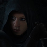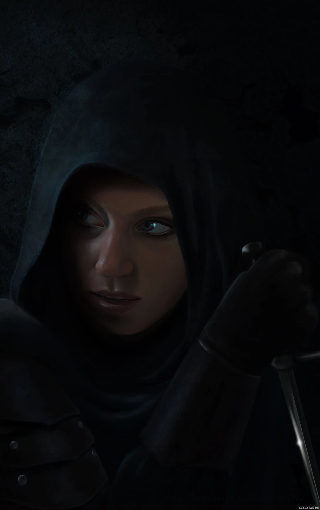 The image shows a character dressed in what appears to be a dark, possibly medieval or fantasy-inspired costume. The individual has a hood over their head and is wearing what could be a mask or a helmet that obscures their face. They are holding onto something with both hands, which seems to be part of their attire, perhaps armor or a weapon. The setting appears to be dimly lit, suggesting
