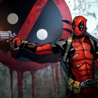 The image features a character known as Deadpool. He is depicted holding a pistol and standing in front of a wall with
