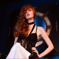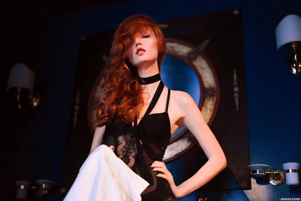 red hair and is wearing a black top, possibly part of a costume or fashion ensemble, along with what appears to be a sheer, lacy garment over it. She is posing confidently, and there are