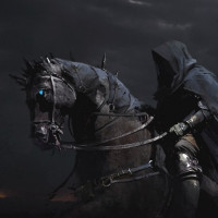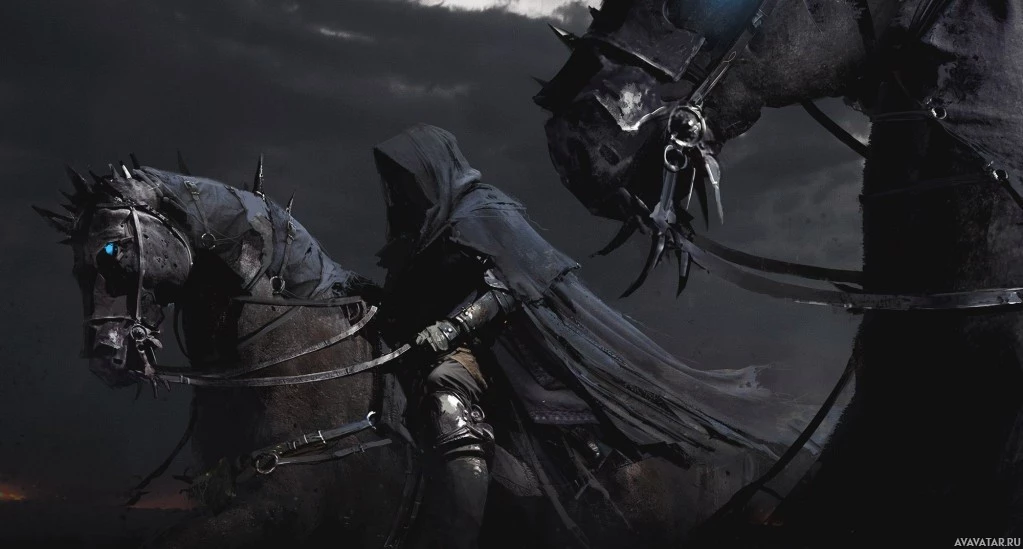 Lord of the Rings: The Fellowship of the Ring," where two characters are riding horses in a dark, stormy environment. One of them appears to be wearing armor and holding a sword, suggesting they might be a warrior or a member of the Fellowship. The setting is reminiscent of scenes from Middle-earth, and the presence of a character wearing what looks like a Nazgul costume adds to the fantasy