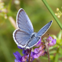 The picture shows a butterfly, specifically a blue and black butterfly with wingtips that appear to be white. It is perched on a plant with purple flowers, which could be considered an insect. There are no animals in the image.