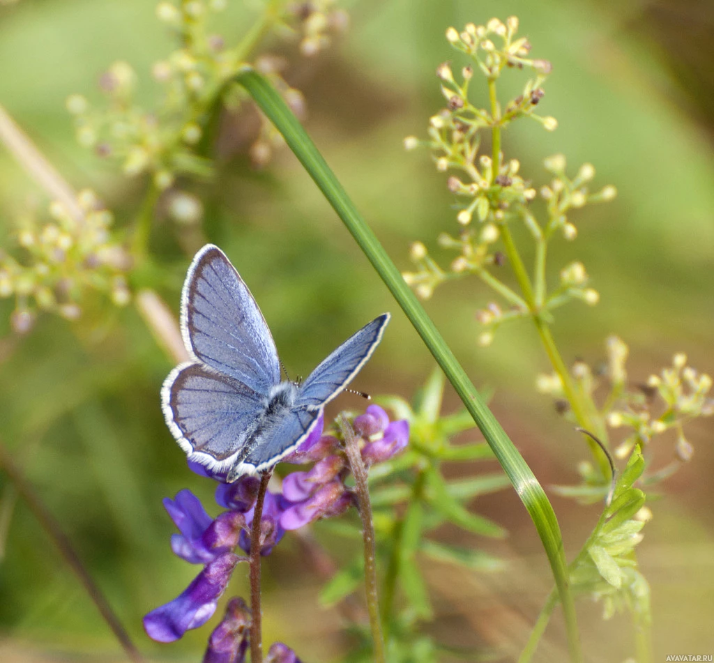 На картине изображена бабочка, в частности синяя и черная бабочка с кончиками крыльев, которые кажутся белыми. Он расположен на растении с фиолетовыми цветами, которое можно считать насекомым. Животных на изображении нет.
