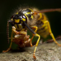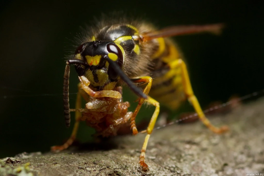 На картинке изображена желтая оса куртки. Это насекомое с яркими цветами и известно своим агрессивным поведением, особенно при защите своего гнезда или потомства.