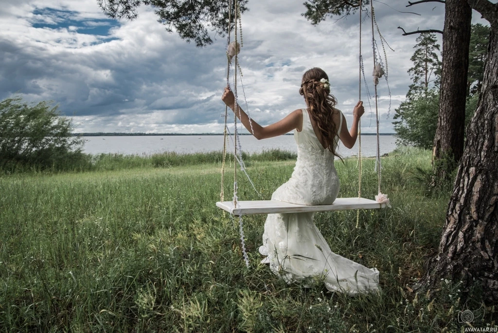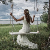 a bridal dress, suggesting they might be a bride or are dressed for a wedding. The backdrop includes greenery and trees that could indicate