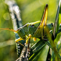 green vegetation, possibly a plant or grass. The grasshopper has a body segmented into three parts with visible antennae and wings that are folded at its sides. There is also a small amount of