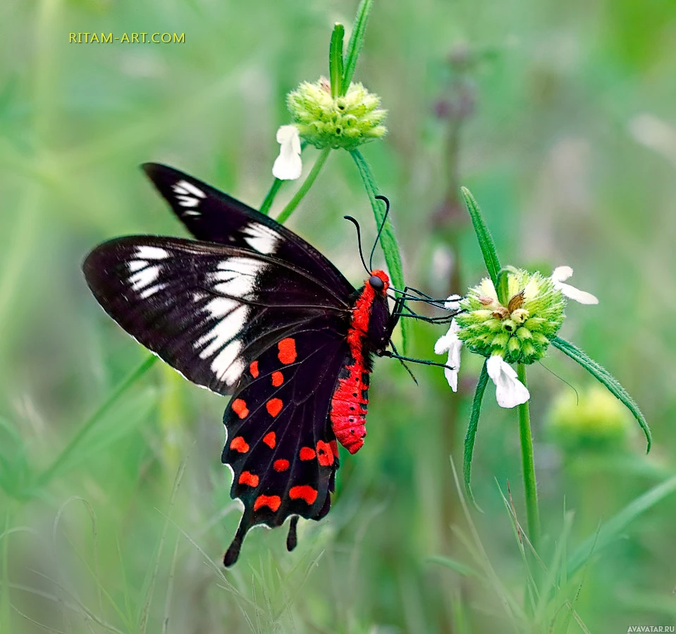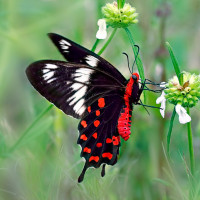 Картинка показывает бабочку, сидящую на какой-то листве. Бабочка имеет отличительные красные и черные крылья с белыми пятнами, что характерно для вида Lysandra nessus. Похоже, что он питается или отдыхает среди зеленой растительности.