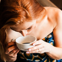 The image shows a red-haired woman holding a cup, presumably containing coffee. She appears to be enjoying the beverage and is seated at what looks like a table or countertop. Her attention seems focused on the cup as she drinks.