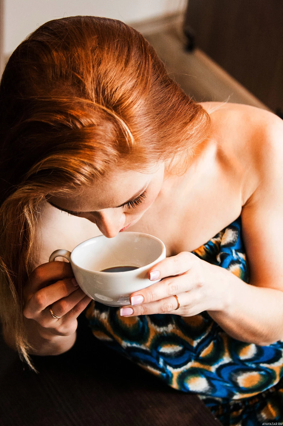 рыжие волосы | Red-haired | Рыжеволосая девушка наслаждается чашечкой кофе