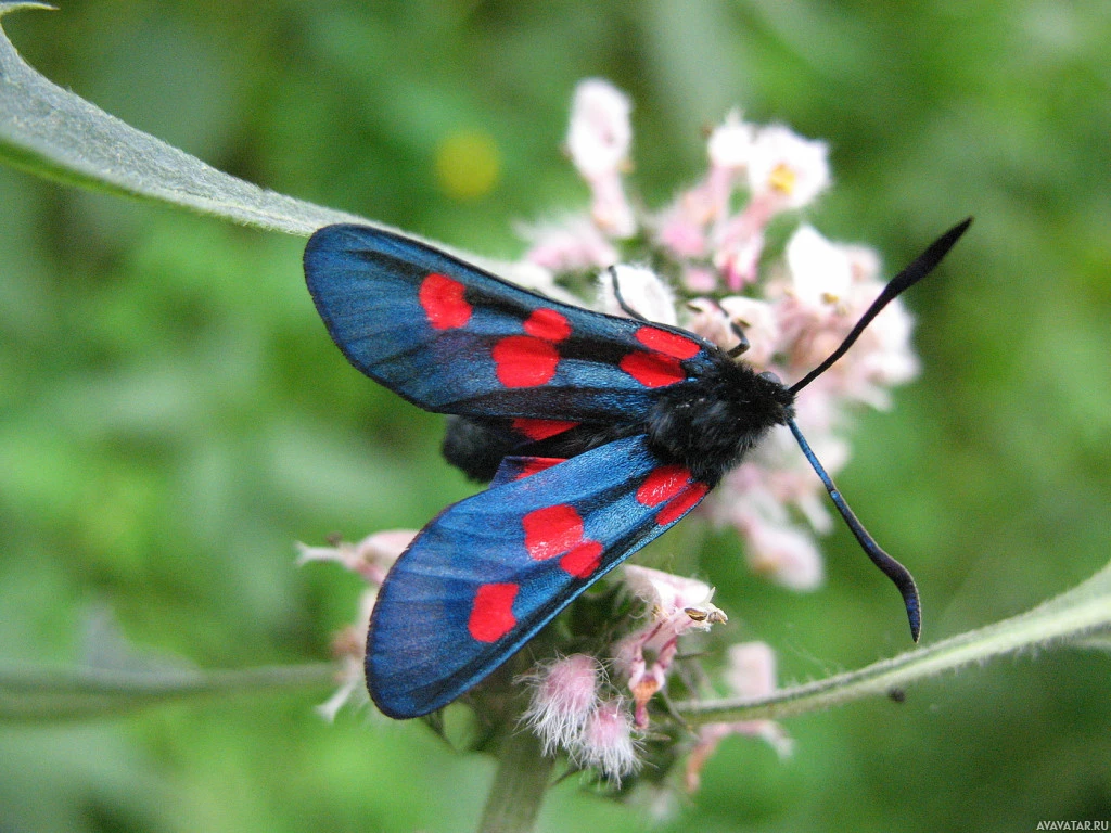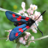 The image shows a blue and red butterfly perched on a plant. This is an example of an insect, specifically a butterfly, which can be identified by