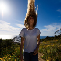 a body of water. The person has their head tilted back and is raising both hands in the air, possibly expressing joy or freedom. There are some