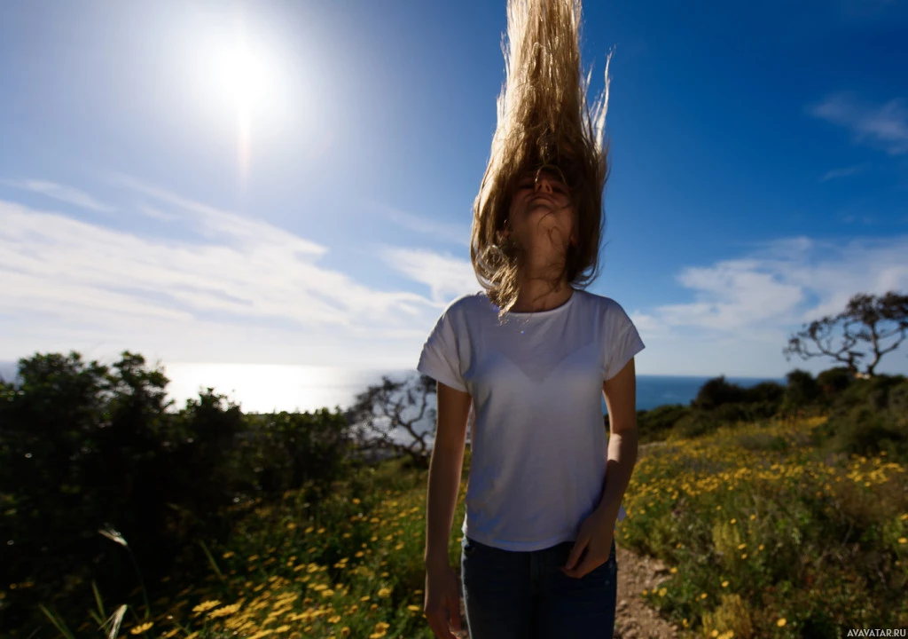 The image shows a person standing outdoors on what appears to be a hill or a headland overlooking