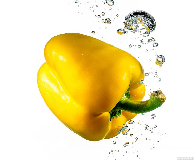 The image shows a fresh, vibrant yellow bell pepper with visible seeds and